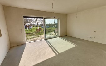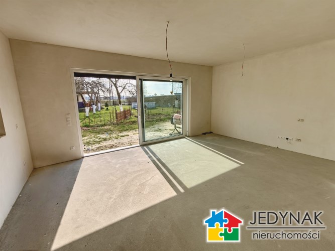 Przestronny i jasny salon z aneksem kuchennym i wyjściem na taras.