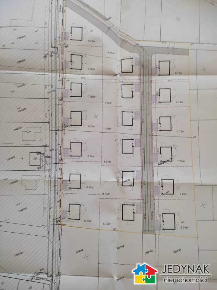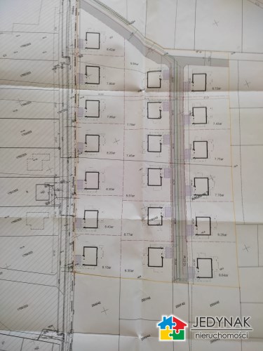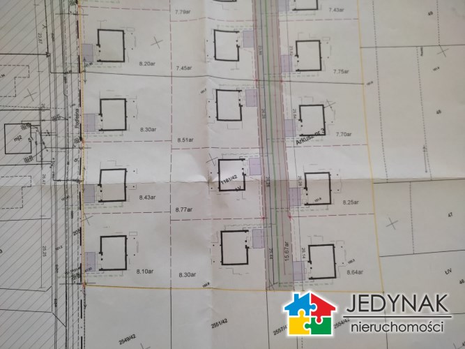 Projekt podziału przewiduje powstanie 9 działek o  kształcie regularnych prostokątów i powierzchniach od 770 do 877m2 oraz działki stanowiącej drogę dojazdową.