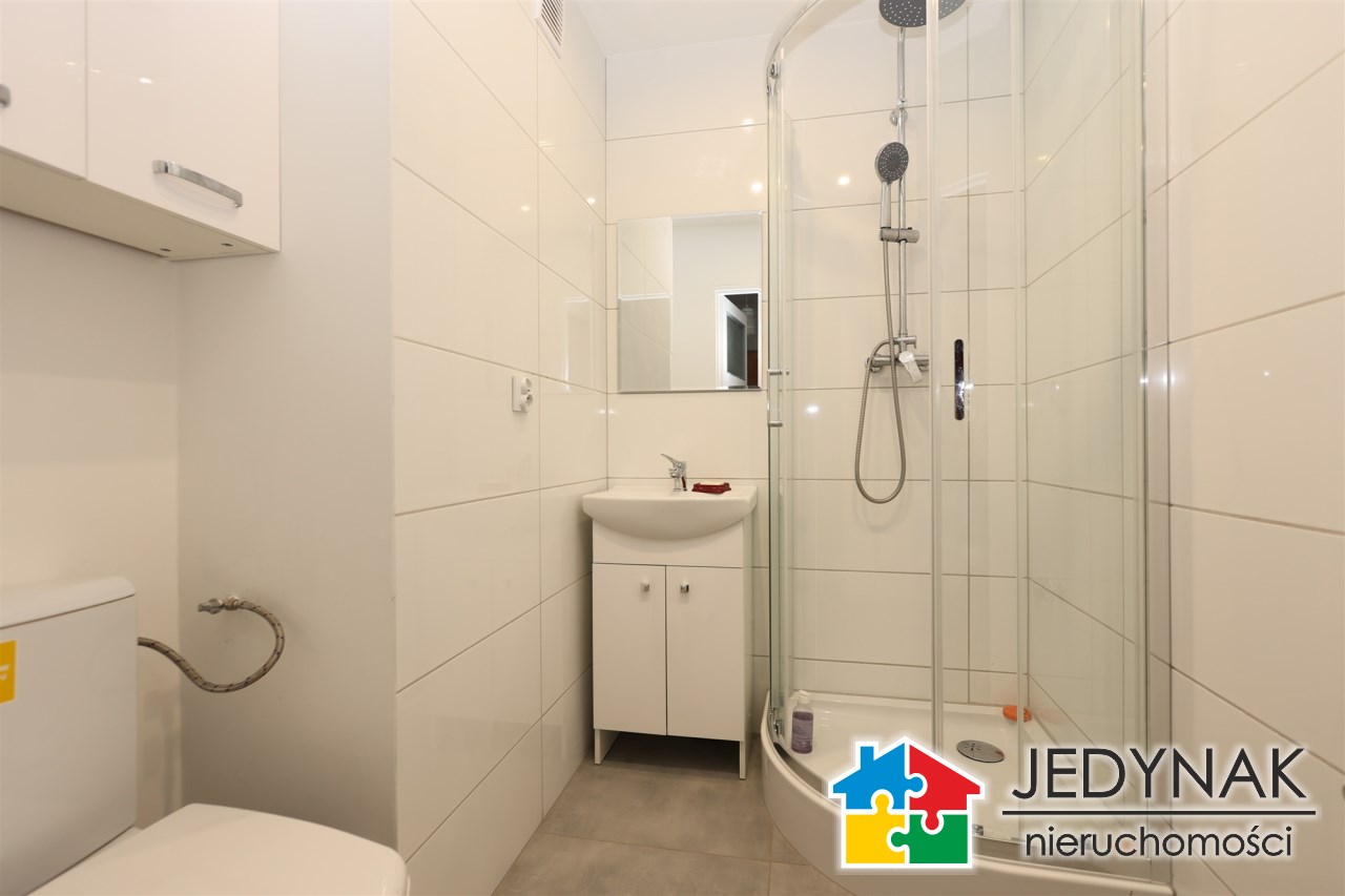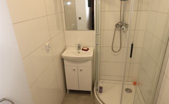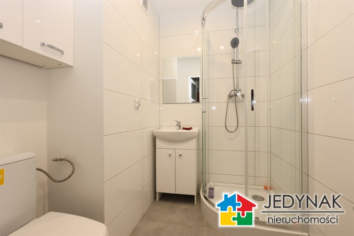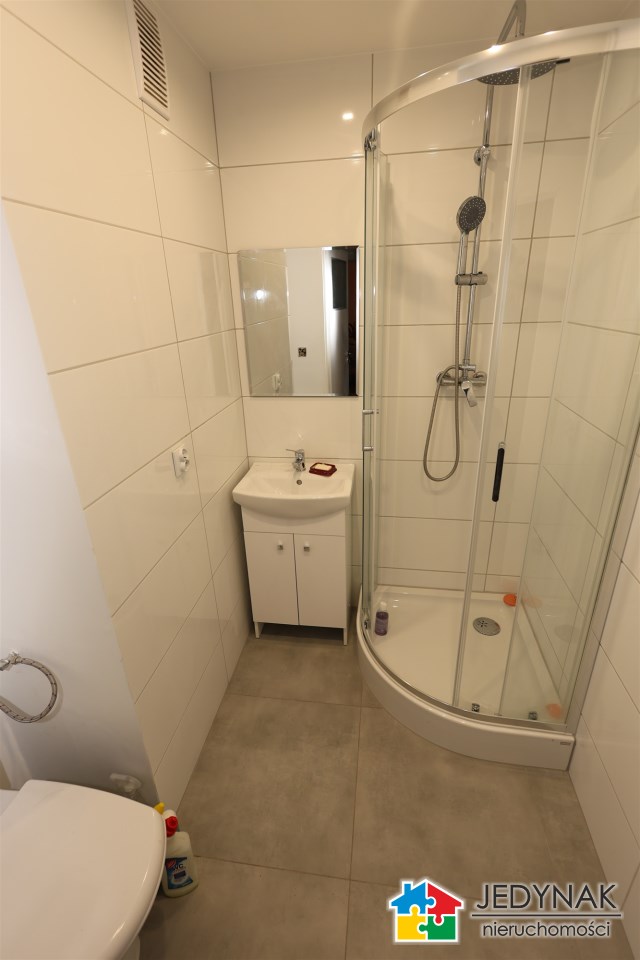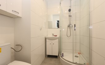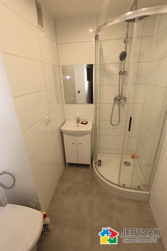 • Łazienka po remoncie: Wykończona w jasnej kolorystyce, z nowoczesną kabiną prysznicową, umywalką z szafką oraz nową armaturą.