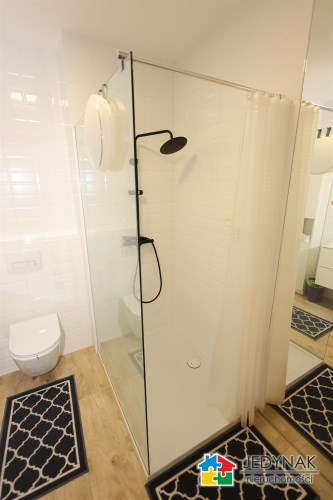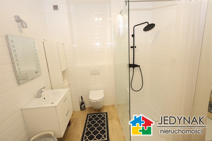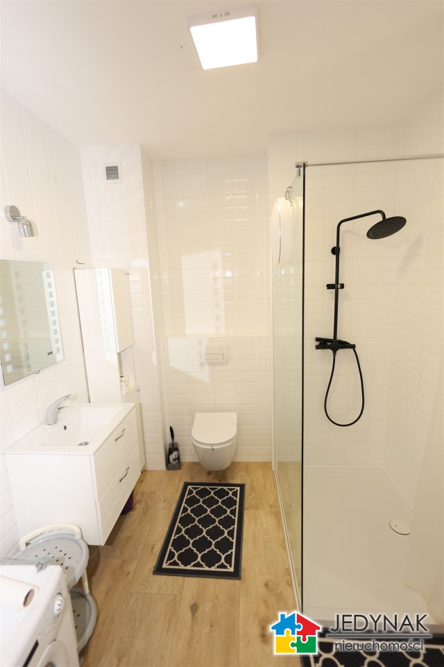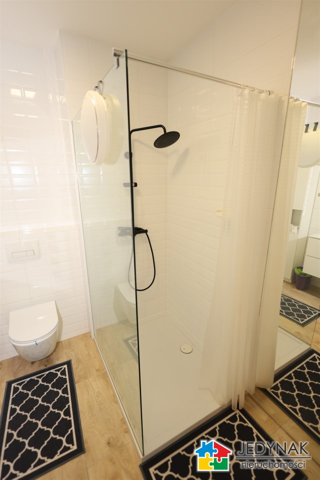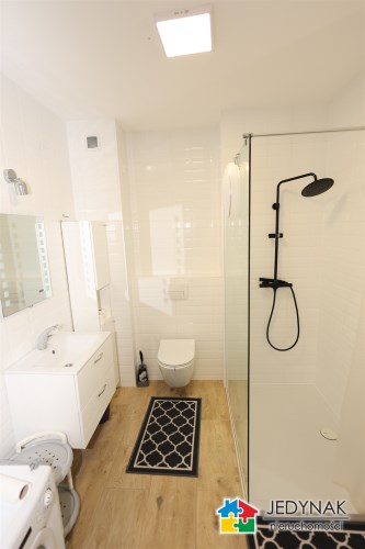 Łazienka: Nowoczesna, połączona z WC, wykończona materiałami wysokiej klasy.